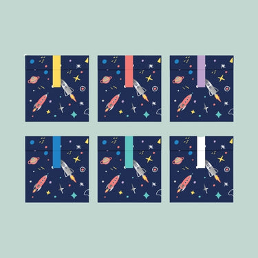 Avaruusteemaiset lahjapussit sopivat täydellisesti pienten juhlayllätyksien tai makeisten pakkaamiseen. Pussit on koristeltu hauskoilla avaruusaiheisilla kuvioilla, ja ne hurmaavat kirkkailla väreillään ja leikittelevällä tyylillään.