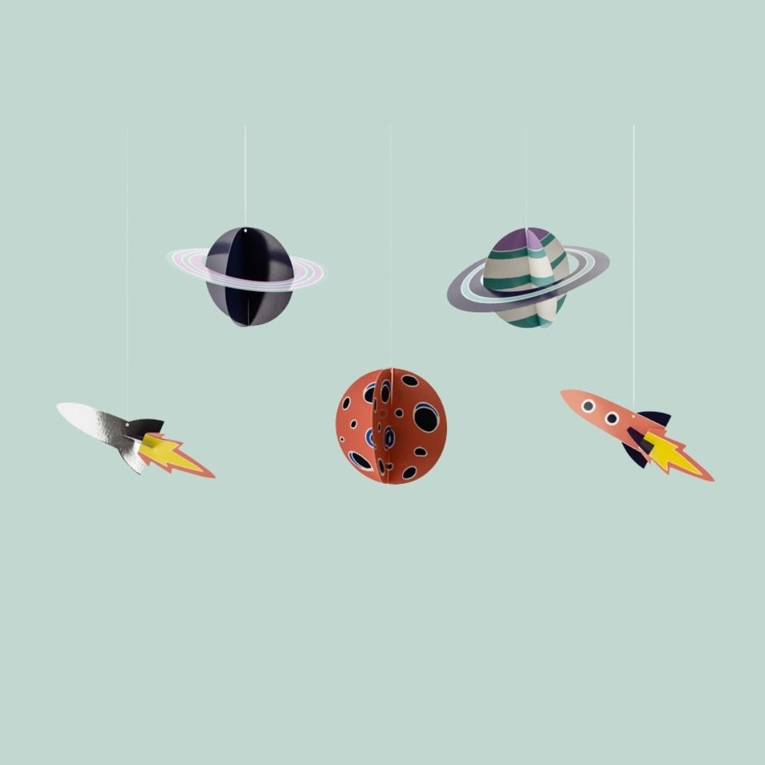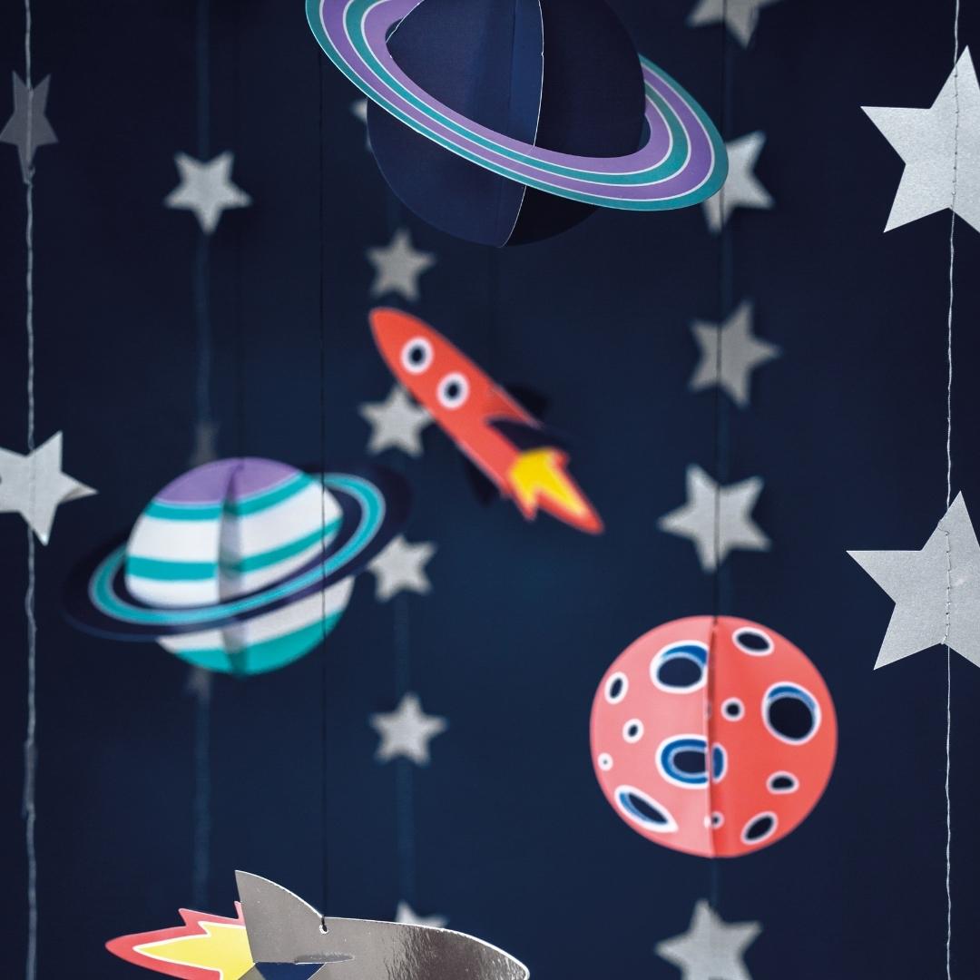 Lennä avaruuteen näillä hauskoilla roikkuvilla koristeilla! Paperista valmistetut avaruusteemaiset koristeet ovat helppoja koota ja täydentävät lasten juhlat värikkäällä ja seikkailullisella tunnelmalla.