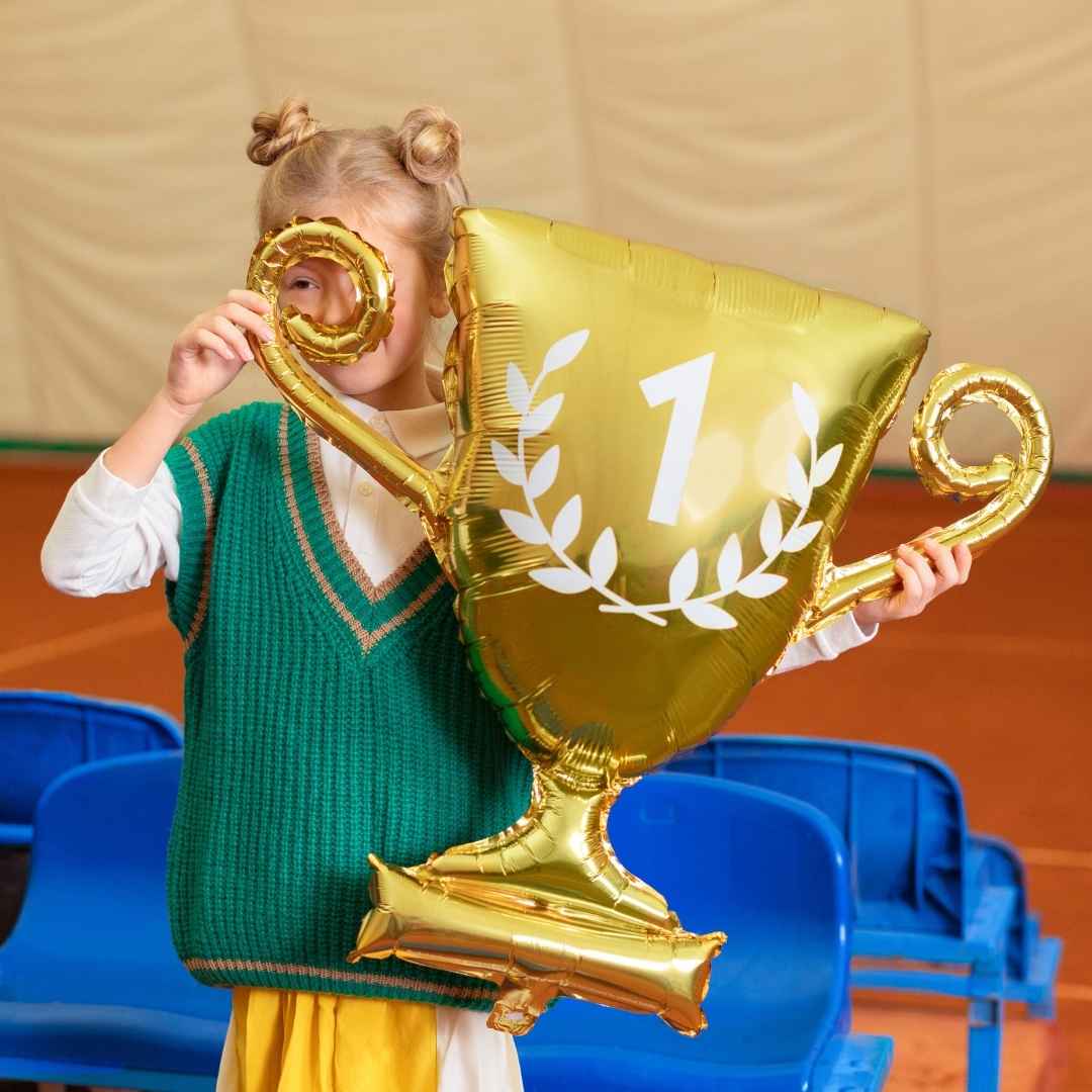 Kullanhohtoinen pallo valkoisella "1" painatuksella on täydellinen koriste urheilujuhliin, syntymäpäiville tai kilpailujen voittoseremonioihin – missä tahansa halutaan juhlia sankaria tyylillä.