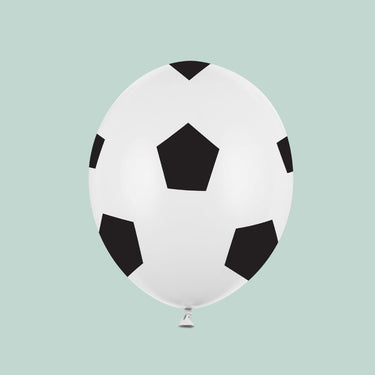 Valkoisissa ilmapalloissa on musta viisikulmiopainatus, joka muistuttaa oikeaa jalkapalloa – täydellinen yksityiskohta futisteemaisiin syntymäpäiväjuhliin tai urheilutapahtumiin.