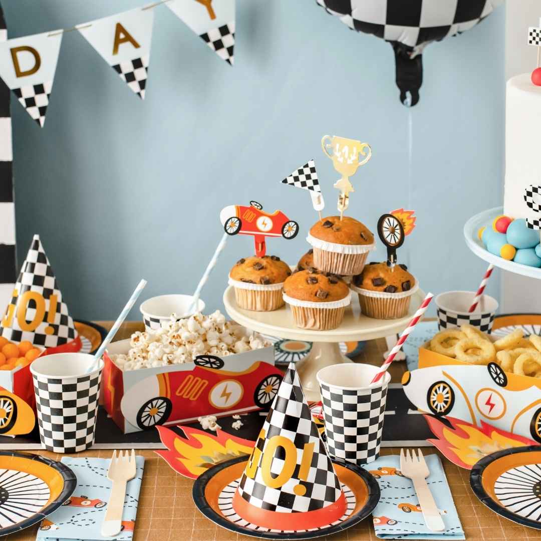 Värikkäät autoaiheiset koristeet kruunaavat lasten syntymäpäivien herkut ja tuovat pöytään iloisen kisatunnelman.