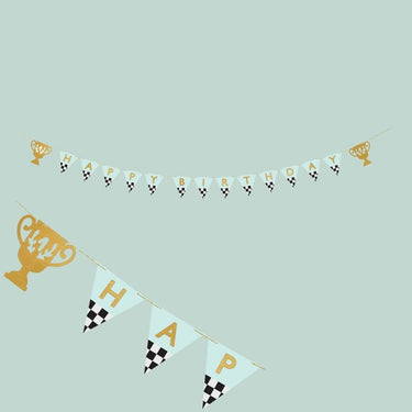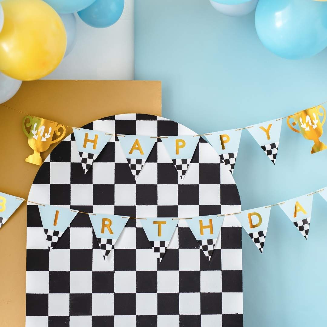 Värikäs ralliautoteeman Happy Birthday -viirinauha tuo juhliin iloista energiaa ja urheiluhenkistä tunnelmaa. Paperista valmistetussa bannerissa on pokaalikuvioita ja monivärinen painatus, joka tekee siitä näyttävän katseenvangitsijan.