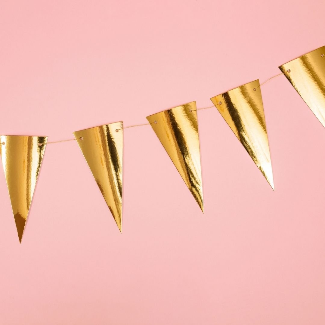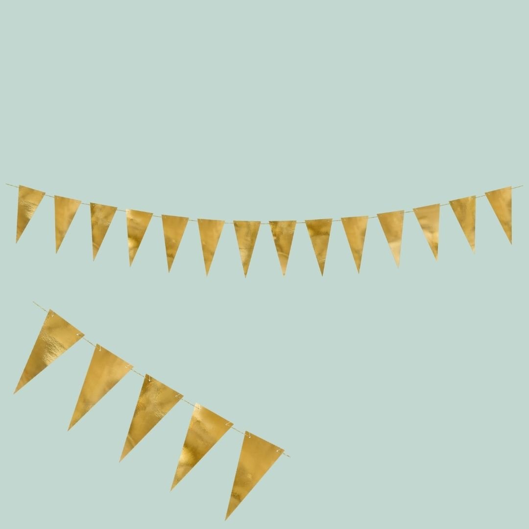 Upeasti hohtava peilikiiltoinen kultainen viirinauha viimeistelee juhlakoristelun tyylikkäästi. Setissä on 14 kiiltävää viiriä ja noin kolmen metrin pituinen kullanvärinen naru, johon ne pujotetaan. Viirinauha on helppo koota ja se heijastaa valoa kauniisti luoden juhlaan ylellisen säihkeen.