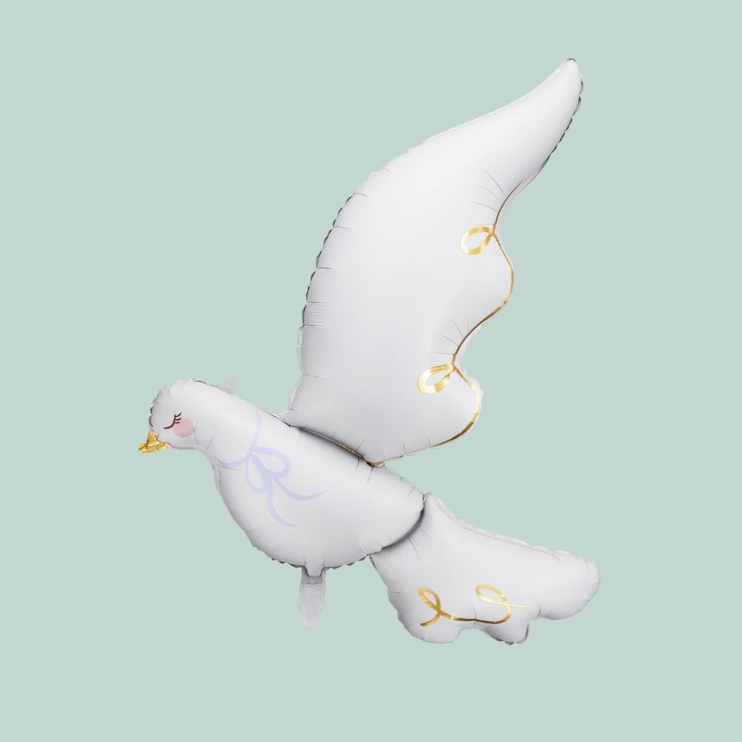 Tämä suurikokoinen folioilmapallo kyyhkysen muodossa on näyttävä ja rauhallinen koriste juhliin, joissa arvostetaan symboliikkaa ja herkkyyttä. Se sopii täydellisesti ristiäisiin, nimenantojuhliin, konfirmaatioon, muistotilaisuuksiin tai hengellisiin juhliin.