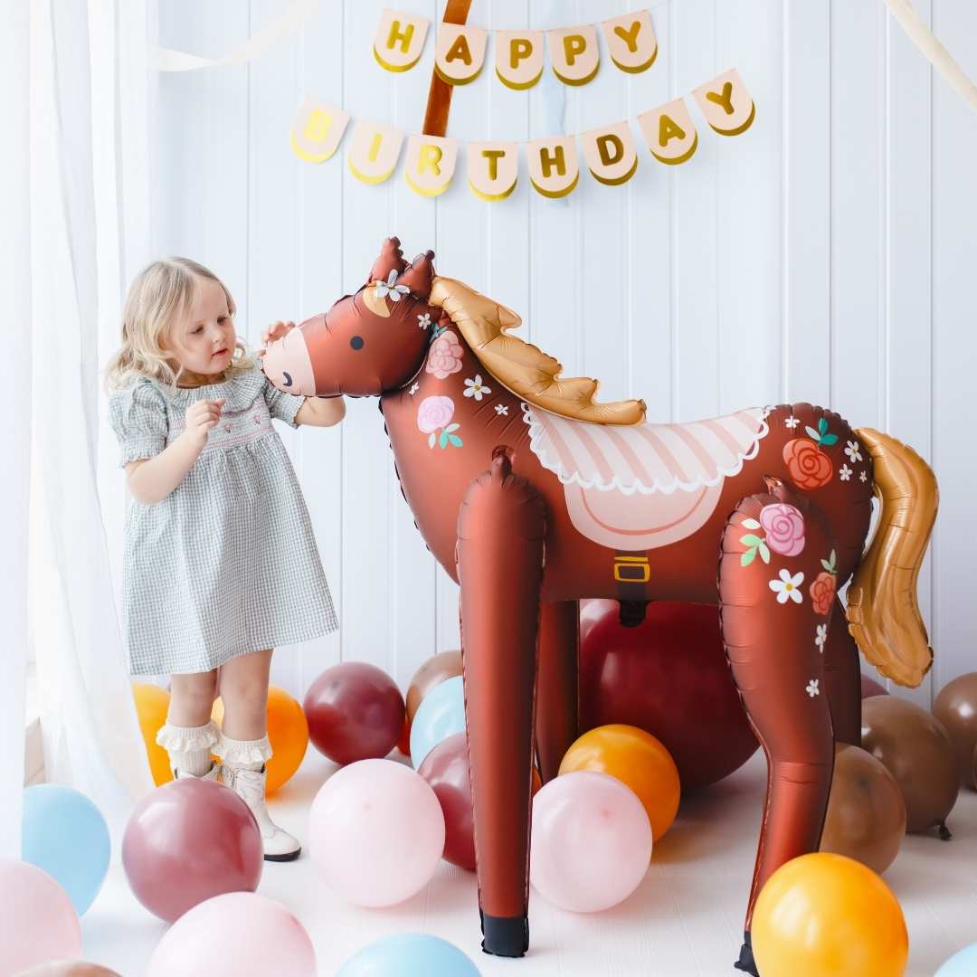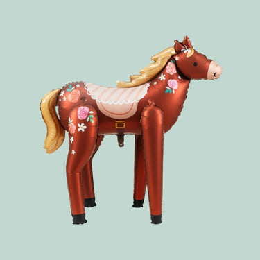 Suurikokoinen hevosen muotoinen foliopallo on näyttävä koriste hevosteemaisiin juhliin ja lasten syntymäpäiville. Monivärinen pallo pysyy pystyssä ilmalla täytettynä ja toimii upeana katseenvangitsijana juhlatilassa.