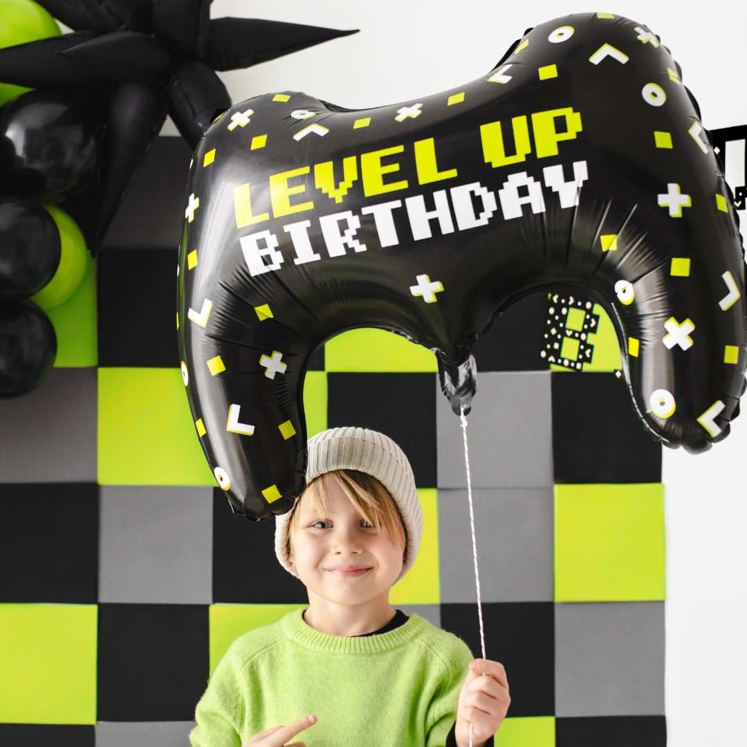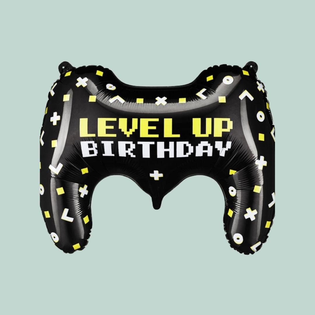 Foliopallo peliohjaimen muodossa mustalla pohjalla ja värikkäällä Level Up Birthday -painatuksella. Sopii hyvin peliteemaisiin juhliin ja syntymäpäiväkoristeeksi.