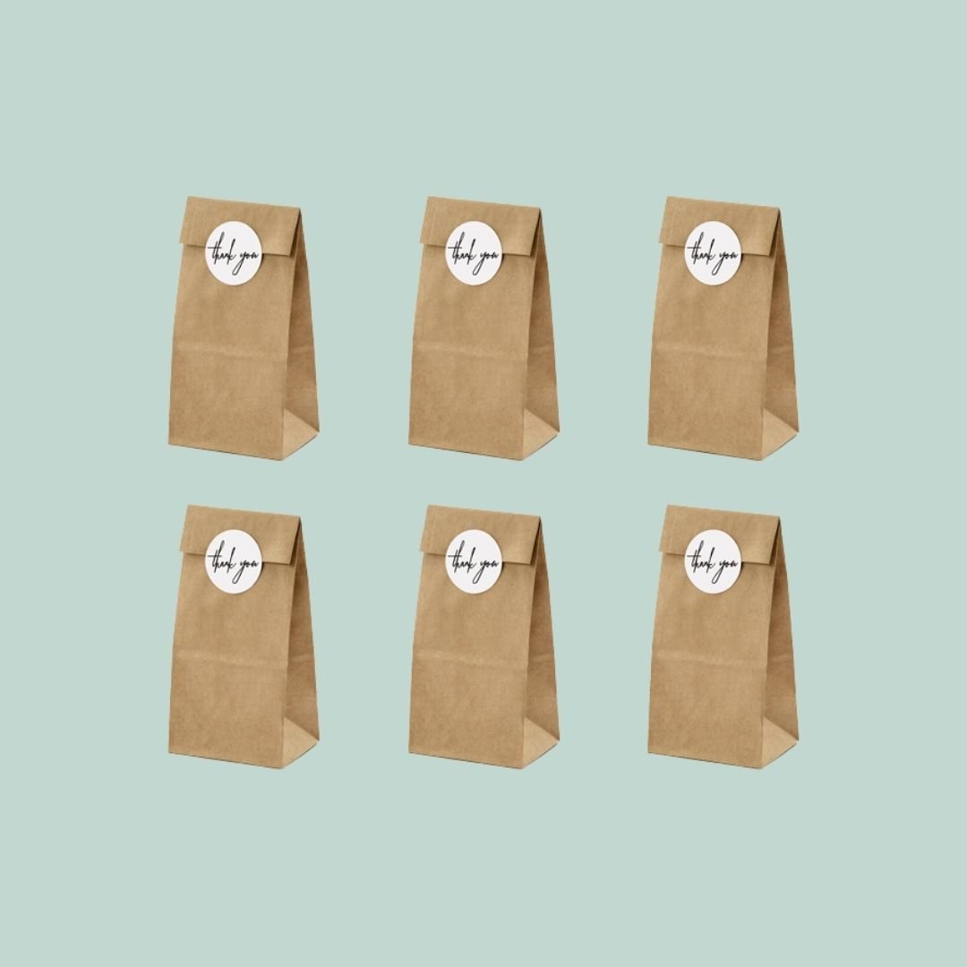 Luonnonruskeat paperiset lahjapussit sopivat täydellisesti pienten lahjojen, makeisten tai muistotuotteiden pakkaamiseen. Setissä on kuusi pussukkaa ja kuusi valkoista Thank you -tarraa kauniiseen viimeistelyyn.