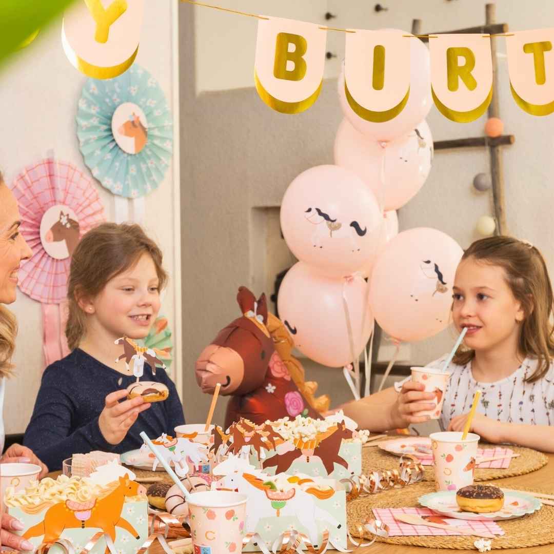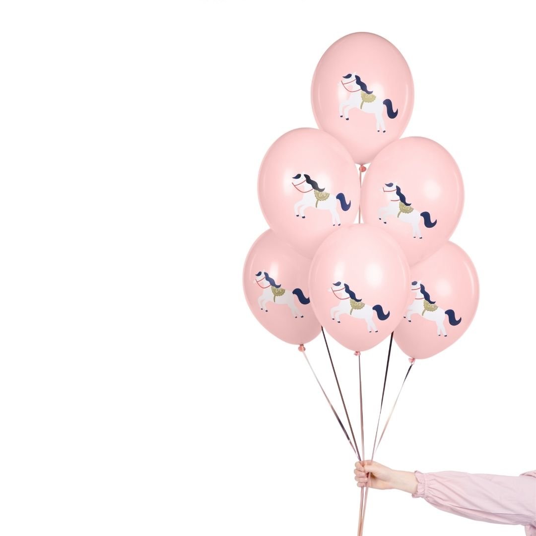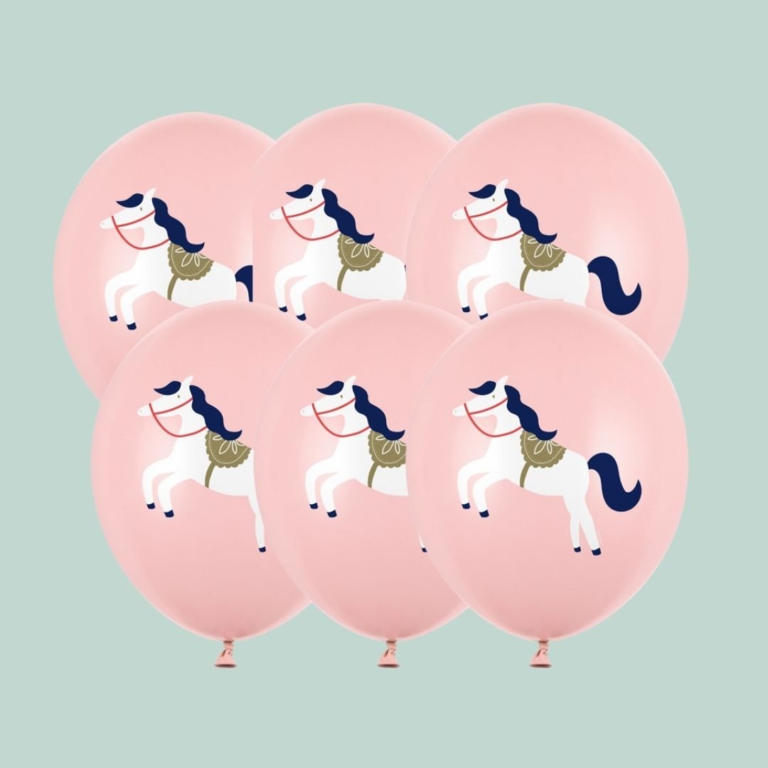 Suloiset heppateeman ilmapallot sopivat täydellisesti heppateeman juhliin. Pastellivaaleanpunaiset pallot on koristeltu monivärisellä hevoskuviolla.