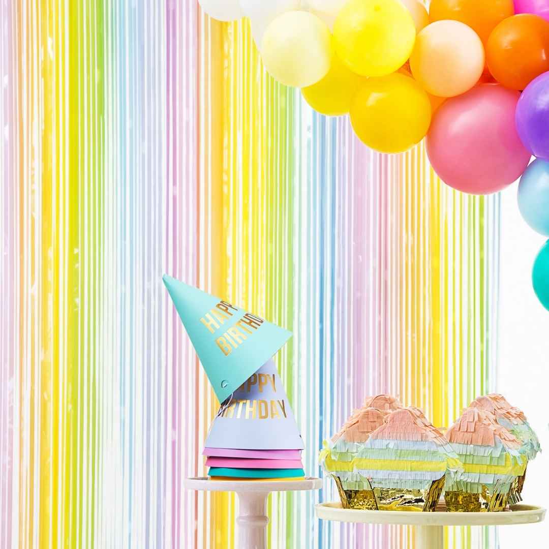 Monivärinen juhlakoristeverho tuo väriä, hempeyttä ja iloisuutta moniin eri juhlateemoihin. Kevyt ja helposti kiinnitettävä verho sisältää vaaleanvihreitä, keltaisia, oransseja, vaaleanpunaisia, liiloja ja vaaleansinisiä sävyjä. Sopii loistavasti taustakoristeeksi, oviaukkoon tai juhlapöydän taakse.