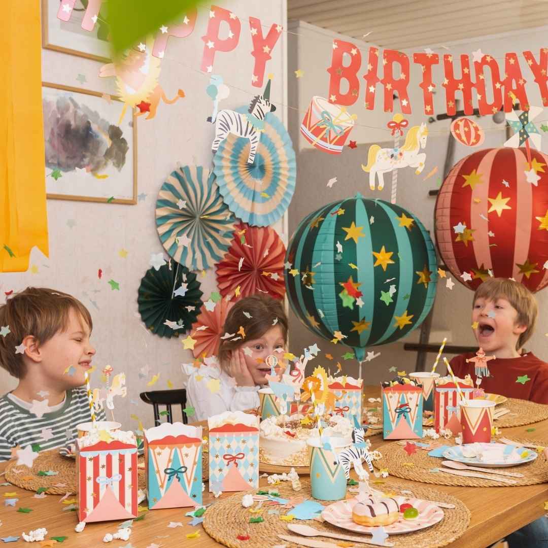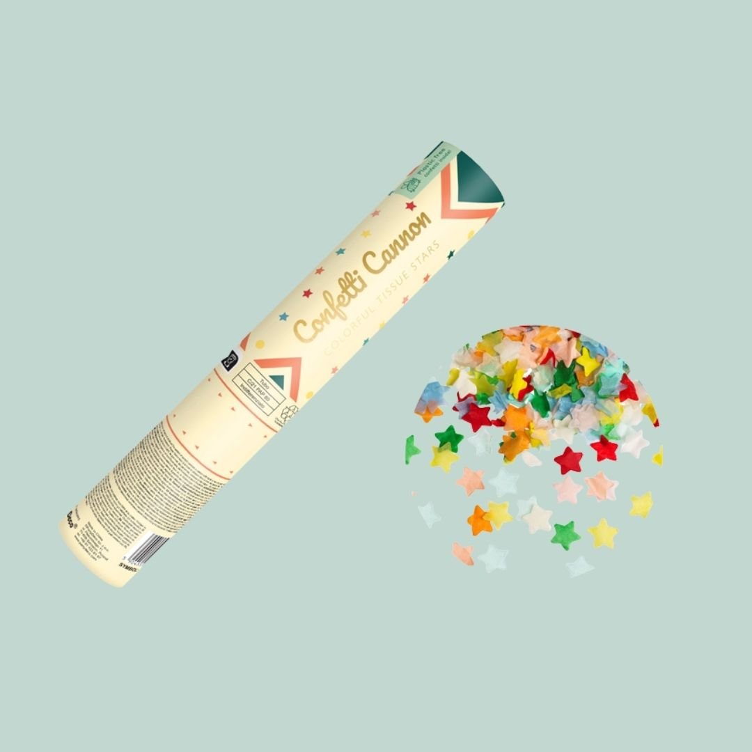 Värikäs sirkusteemainen konfettitykki tuo juhlahetkeen näyttävän yllätyksen! Tykin sisältämä monivärinen konfetti leviää ilmaan pyörteinä ja sopii täydellisesti sirkus- ja karnevaaliteemaisiin juhliin. Sisältää monivärisiä silkkiapeperitähtiä.