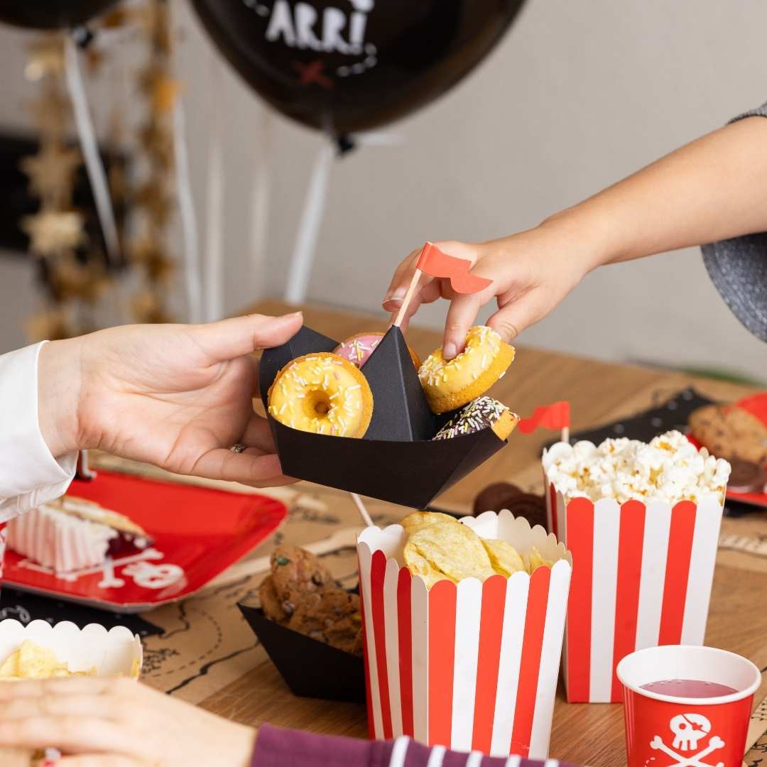 Merirosvovene -paperikoristeet tuovat juhlapöytään hauskaa merirosvoteemaa. Mustat veneet punaisilla lipuilla sopivat täydellisesti merirosvobileisiin ja lasten syntymäpäiväjuhliin.