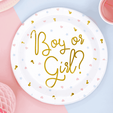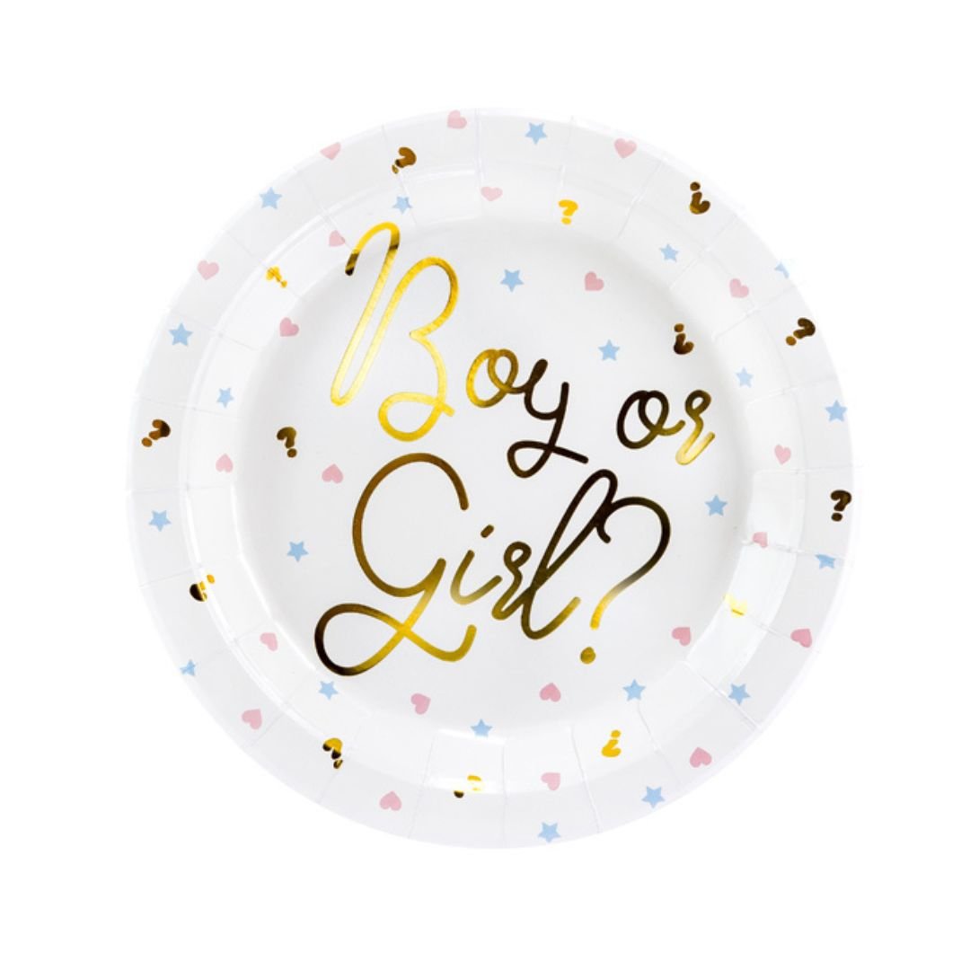 Viimeistele baby shower tai gender reveal -juhla tyylikkäällä kattauksella! Nämä Boy or Girl -teemaiset paperilautaset tuovat juhlapöytään ripauksen kultaa ja teemavärejä. Lautasissa on metallinhohtoinen kultateksti sekä raikas sekoitus vaaleansinistä ja vaaleanpunaista – täydellinen yhdistelmä, kun sukupuoli on vielä yllätys.