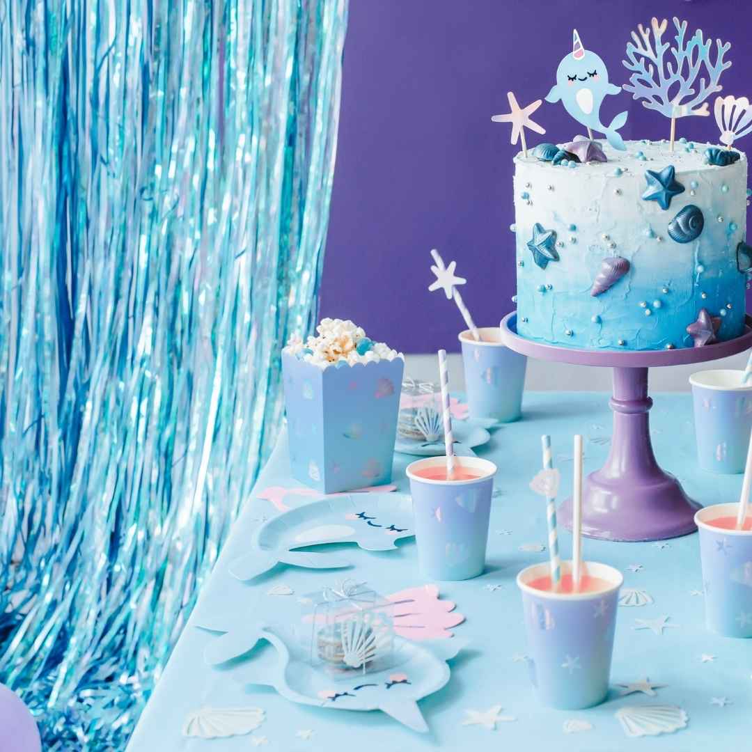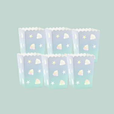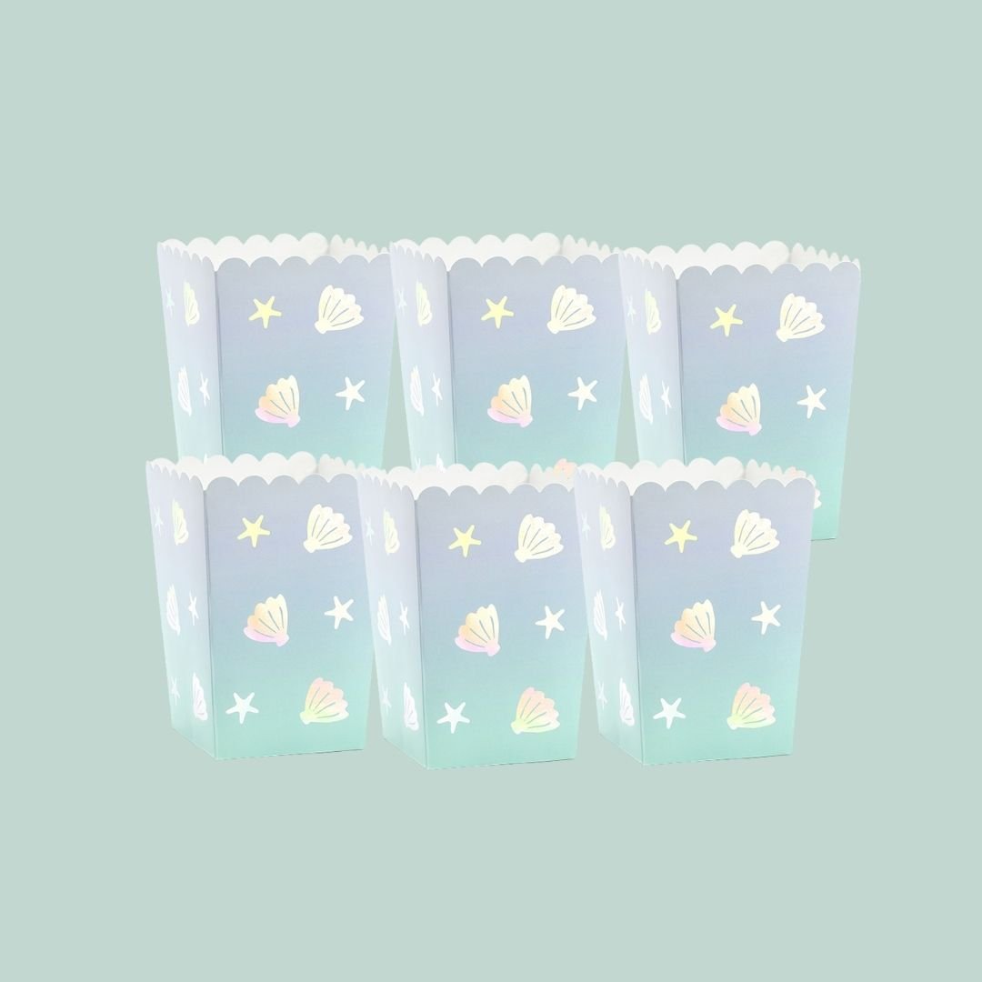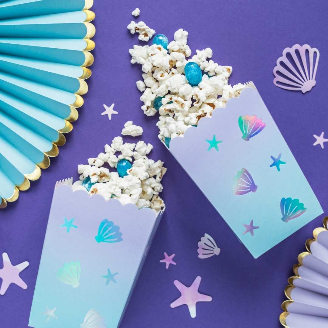 Pastellisävyiset meriaiheiset popcorn-rasiat sopivat täydellisesti lasten juhliin ja meriaiheisiin kattauksiin. Rasiat ovat helppoja koota ja niissä on suloinen ja kiiltävä merielementtien kuvitus, joka viimeistelee juhlapöydän ilmeen.