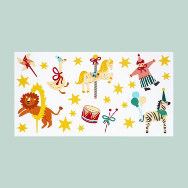 Värikkäät sirkusteeman väliaikaistatuoinnit tuovat iloa ja hauskuutta juhliin! Setissä on 24 erilaista sirkusaiheista kuviota, kuten pellejä, eläimiä ja ilmapalloja. Tatuoinnit ovat helposti kiinnitettäviä ja pestävissä pois vedellä ja saippualla.