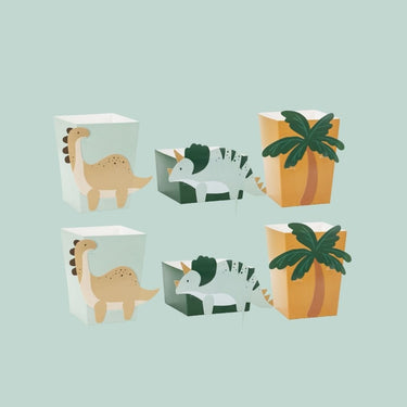 Paperiset Dinosaurs-teemaiset tarjoiluastiat sopivat erinomaisesti pienten herkkujen, kuten popcornin, keksien tai karkkien tarjoiluun. Setissä on neljä isoa ja kaksi pientä rasiaa sekä kuusi dinosaurusaiheista paperielementtiä koristeeksi.