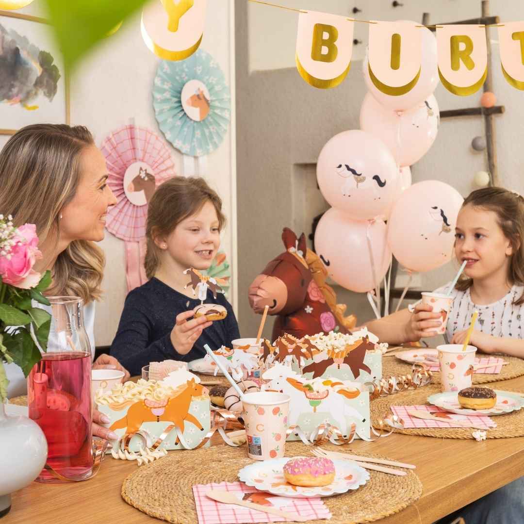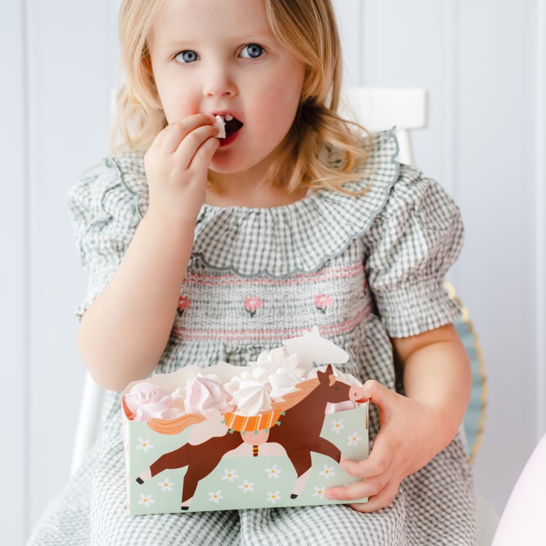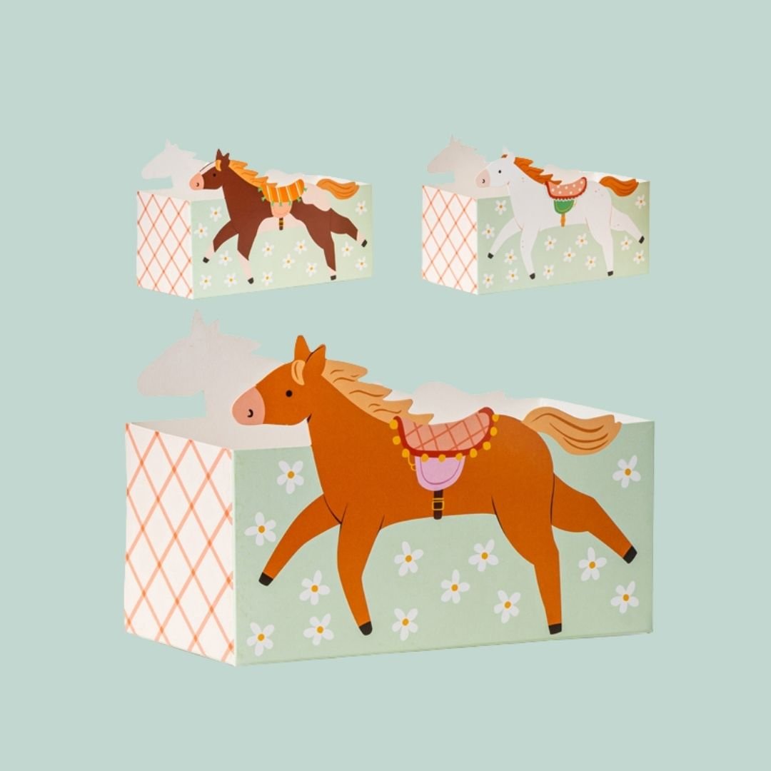 Paperiset heppateemaiset tarjoilurasiat sopivat täydellisesti herkkujen, kuten keksien, karkkien tai pienten välipalojen tarjoiluun. Pastellisävyinen värilajitelma ja hevosteema tekevät niistä kauniin lisän juhlapöytään.