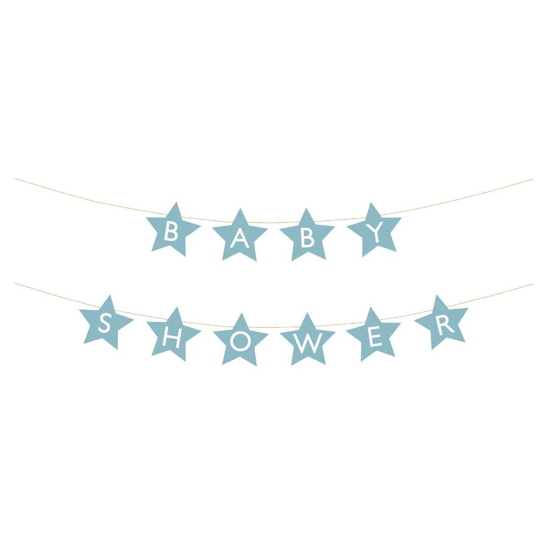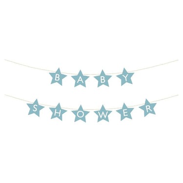 Kaunis Baby Shower -viirinauha tähdenmuotoisilla koristeilla on täydellinen lisä vauvajuhlien somistukseen. Vaaleansininen värimaailma luo pehmeän ja harmonisen tunnelman, ja pitkä banneri toimii upeasti taustaseinänä, juhlapöydän yllä tai valokuvapisteessä.