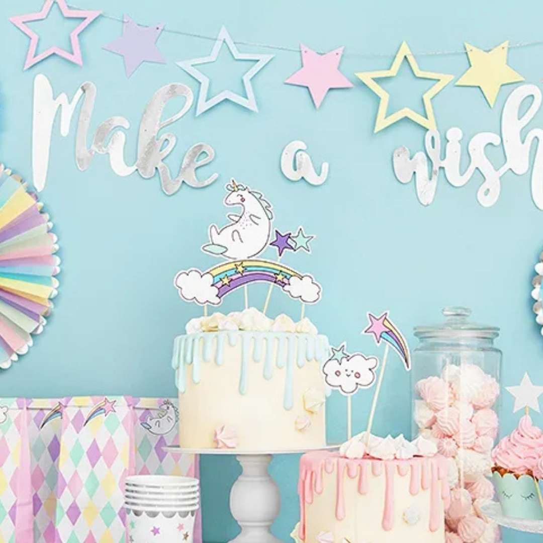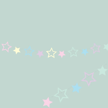 Pastellisävyinen yksisarvisteemaan sopiva tähdistä koostuva viirinauha. Se on suloinen lisä yksisarvisteemaisiin juhliin tai muihin pastellinsävyisiin teemoihin. Setissä on kymmenen tähdenmuotoista paperikoristetta ja noin kahden metrin pituinen naru, johon koristeet kiinnitetään.